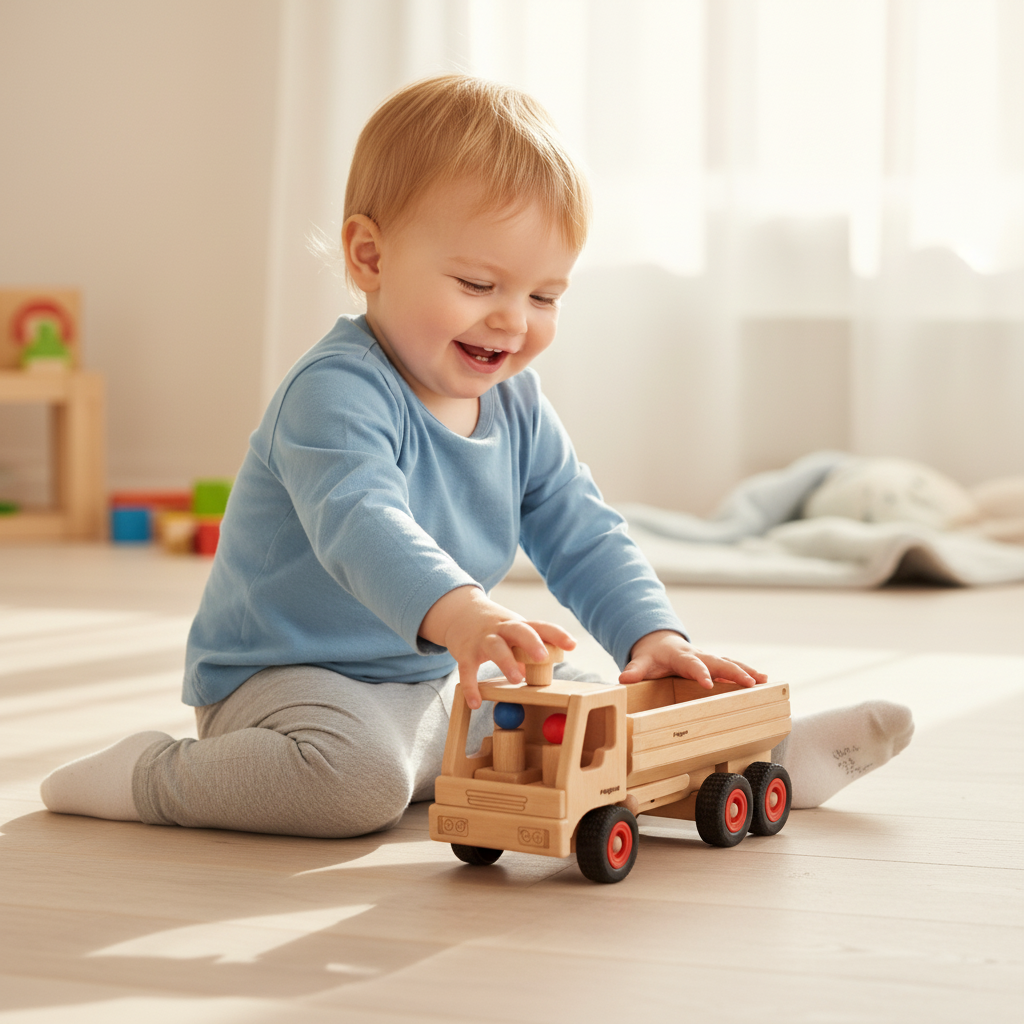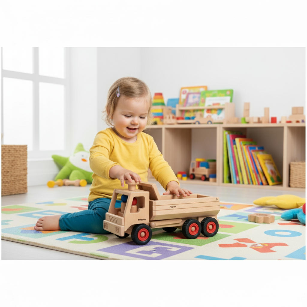 The truck tipper is indispensable on every construction site and has been a bestseller in the fagus range for more than 30 years. The loading area can be tilted and the tailgate can be opened or closed. The vehicle is steerable. Two drivers (red and blue) are included in the delivery.