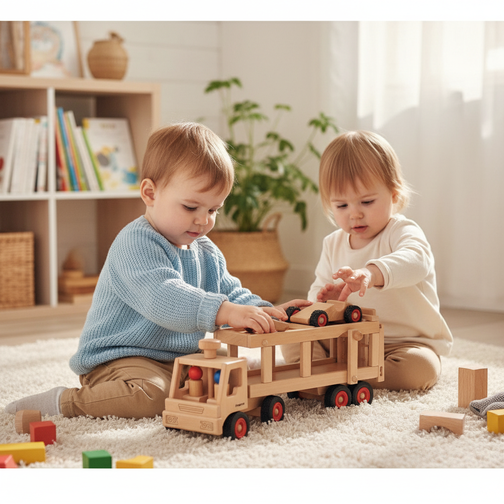 The car transporter from fagus never fails to impress with its technical sophistication: the upper deck is lowered with a single movement and after the rear loading flap has been folded down, the new cars can be transported to the dealer. The vehicle is steerable. Two drivers (red and blue) and a knobbly car (Speedy) are included in the delivery.