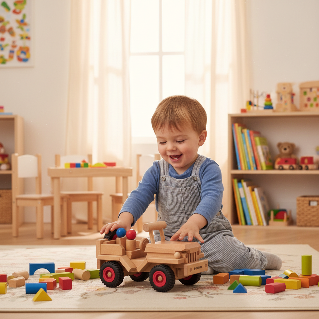 This classic wooden jeep includes two wooden peg people is easily steerable and measures approximately 11 inches in length.