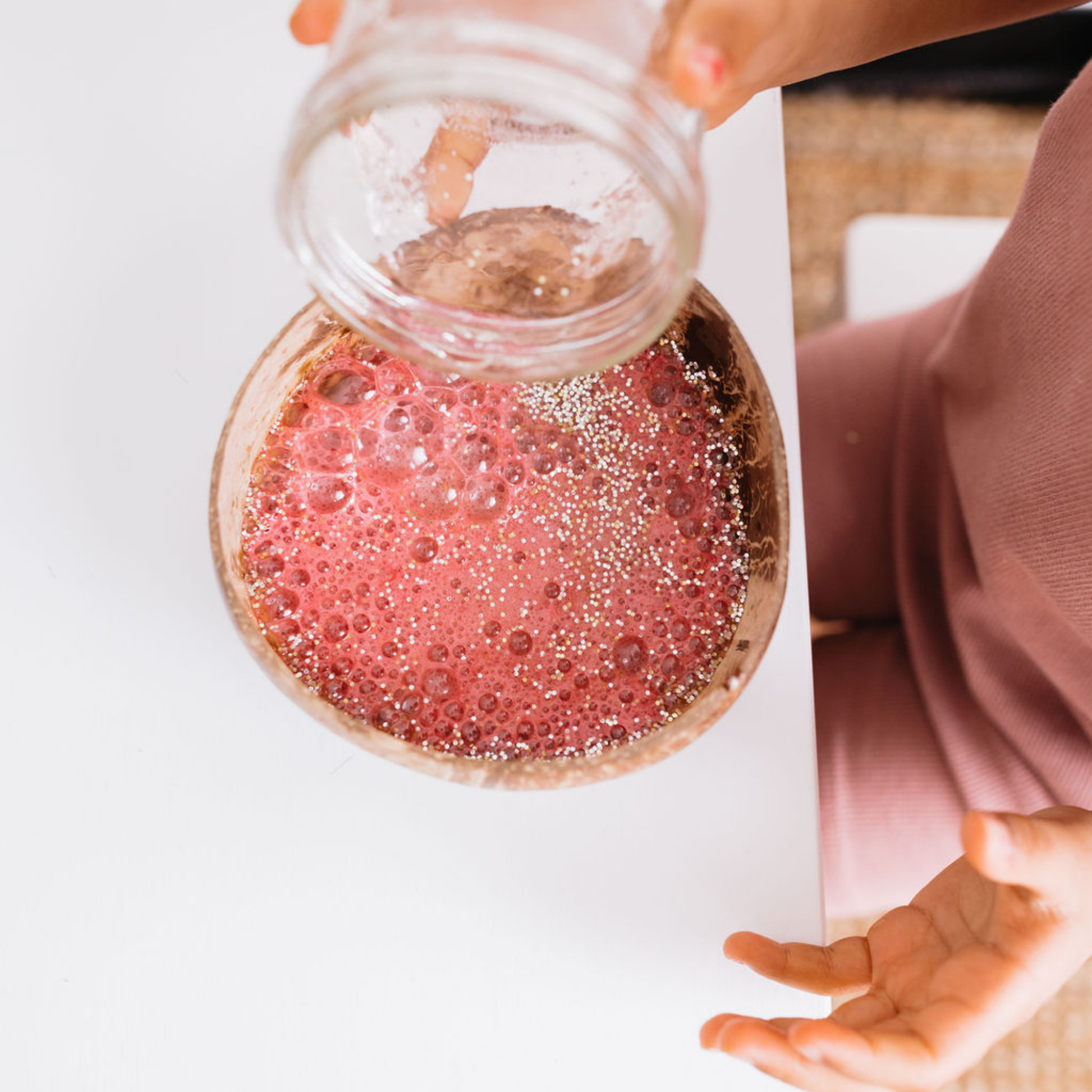 Potion Play is designed to inspire mindful water play. Just add a few spoonfuls of the mixture into a large bowl, pour in water, and watch as your potion bubbles and sparkles.